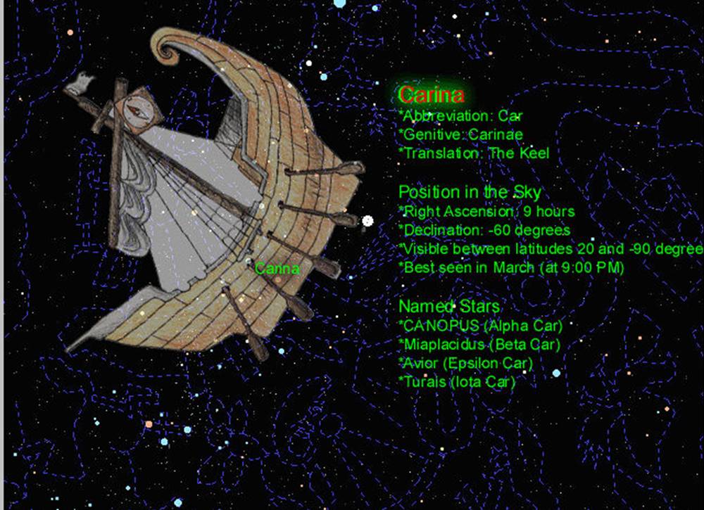 Argo Navis, the Ship was once a huge constellation far to the south, backing across the sky, its stern beneath the hindquarters of Canis Major. Later it was split into three smaller more manageable groups - Puppis, the stern; Vela, the sail; and Carina, the keel.