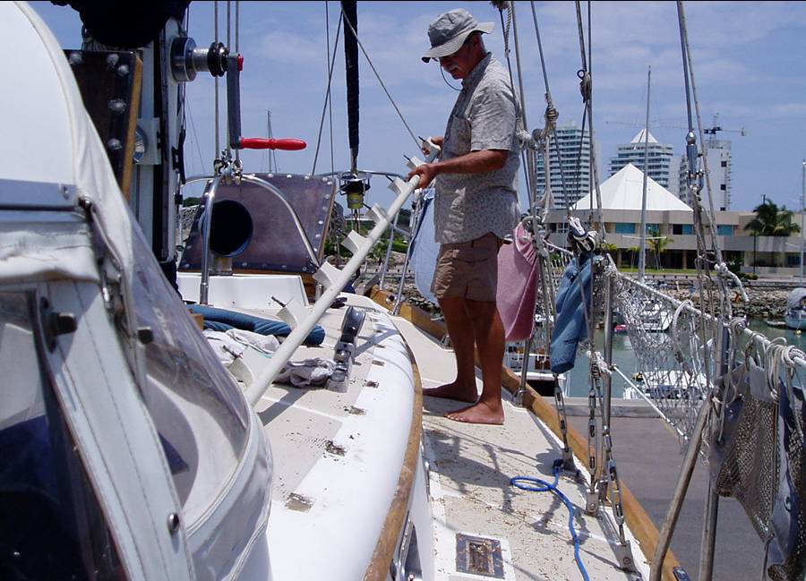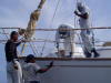 Leslie takes a trip up the mast to clean the mast and standing rigging, a filthy and uncomfortable job. |