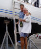 With topsides paint done but much work still remaining we moved back home on June 6, 2007. Ed on Kuay provided the celebratory champagne. |