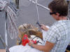 It was inevitable; somehow we chipped the new paint. Here, Philip (wearing his disreputable "wallow in the boatyard dirt" shirt) uses a tiny amount of catalyzed paint and a fine paintbrush to repair the ding. |