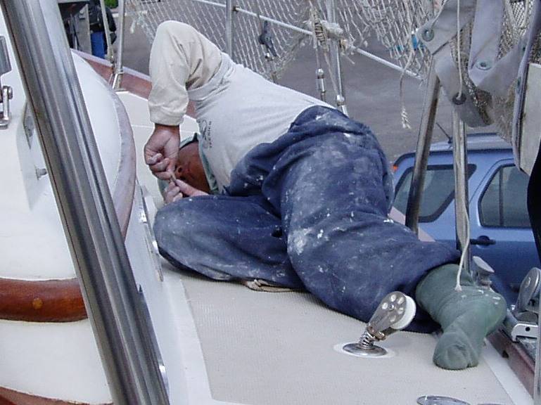 First we taped and then dryfit the grabrails which had received 50 or more coats of varnsh while we were awaiting the painting. Philip is shown preparing to apply adhesive sealant. The next step was to go below to add washers and nuts to torque the crabrails in place. |