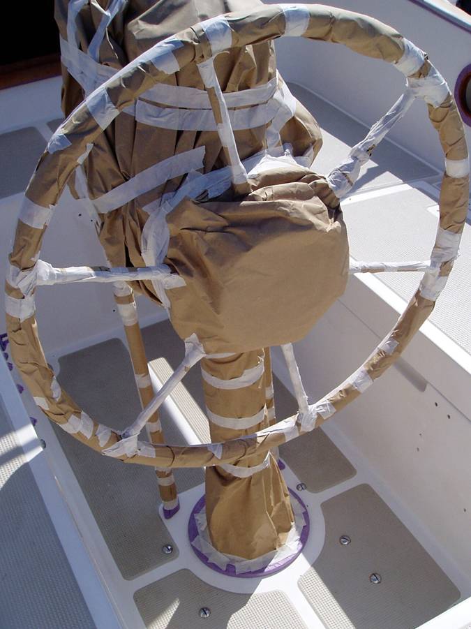 We stripped most hardware and all of the brightwork (teak woodwork) in preparation for a complete professional topsides two-part polyurethane paint job. |