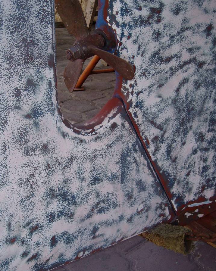 When the rudder was ground we discovered a few new blisters that were weeping water. The chain resting against the rudder (a definite no-no) was later moved by the boatyard. |