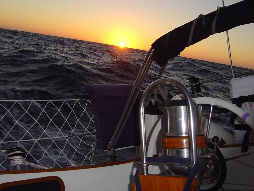 Dawn of the first morning at sea was perhaps the most challenging as waves built to a frightening height and we suffered a couple of boardings that filled the cockpit and dampened our spirits. The odd thing was that the winds were modest [+/- 20 knots] as compared to the steep and imposing waves. Weather predictions had foretold of 15-20 knots of wind and up to six foot seas; clearly this was not what we experienced. Something else—a storm north of us perhaps—was affecting the seas around us.