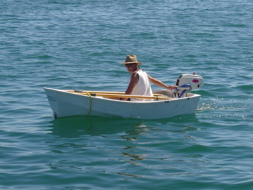 Bacio, our tender, is an 80% scale version of the nesting dinghy "Chameleon", designed by Danny Greene of Bermuda. She was built in our garage of [primarily] 4 mm okoumé plywood using epoxy and the stitch-and-glue method. Bacio is propelled by oars and a 3.3 Mercury outboard. Bacio (pronounced Baah Chee Oh) means "kiss" in Italian.