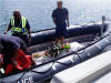 Joan waves goodbye to us as the boat bearing Dan's body departs Pago Pago bound for the open sea. Dan was buried at: 14-19.36 S / 170-39.55W in 1000' of water. |