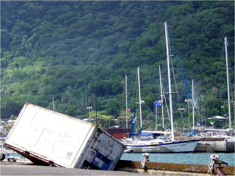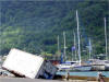 The Aussie yacht Biscayne Bay broke free from the pier at Pago Pago and was severely damaged in the tsunami of Sept. 29, 2009. Waters rose 25 or more feet and relocated boats, cars, containers, etc. |