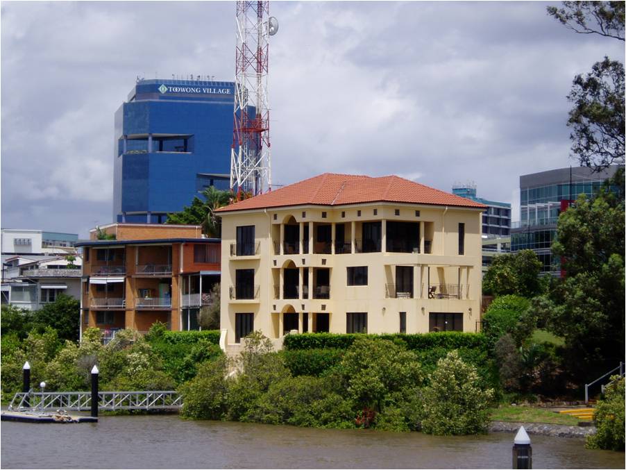 Even today, the Brisbane river's banks are cheek by jowl with mansions, most of which have their own dock. The river, however romantic is filled with man-eating bull sharks. |