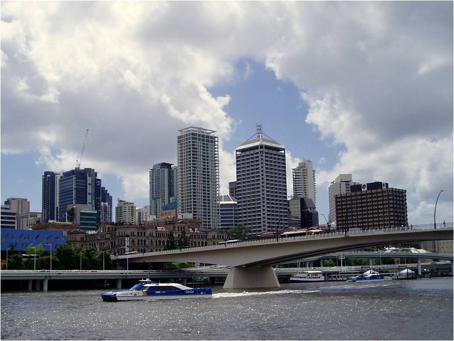 The city of Brisbane sits far upriver (ca 12 km) from the ocean. The ultra-clean, ultra-modern city is served by a plethora of public tranport vehicles including trains, buses and these fast catamaran ferries. |