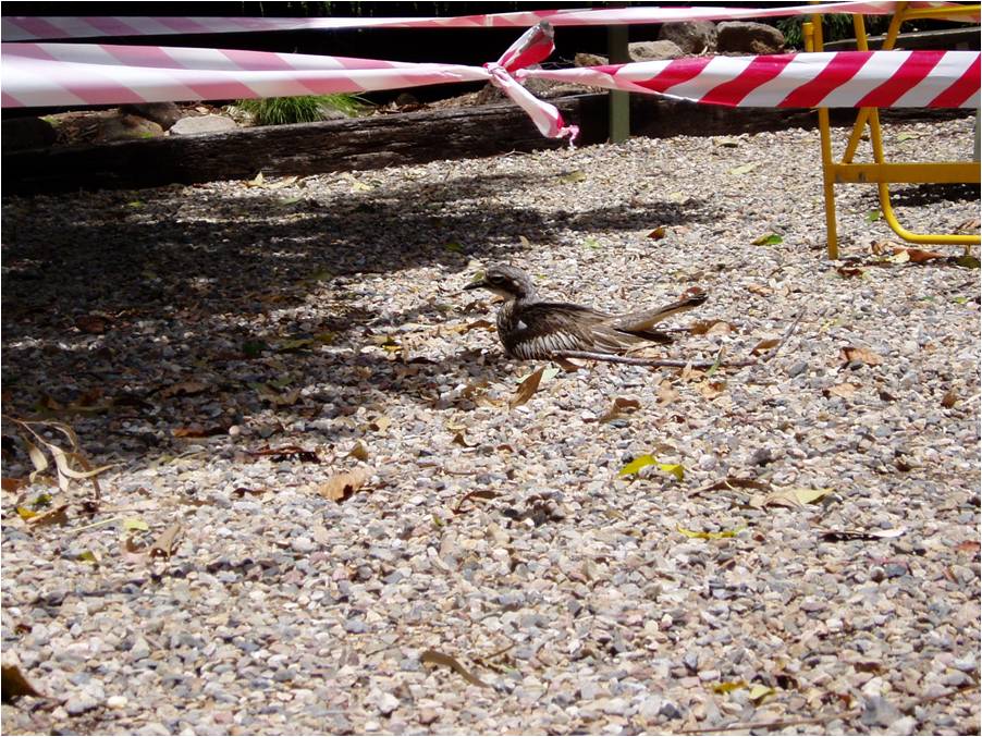 The first koala sanctuary, Lone Pine, was founded in the 1920s and has expanded its animal population into many species. This bird (a curlew?) was outside the sanctuary gates, nesting in the gravel. The biologists had roped off the area to give the poor girl a little protection. |