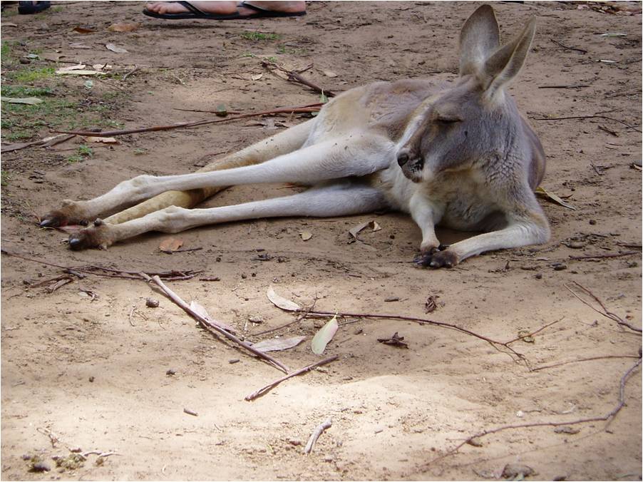 This is an example of an Eastern Grey kangaroo. A crowd of tourists and their chatter was not detering her from napping. |