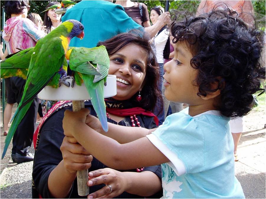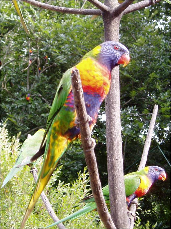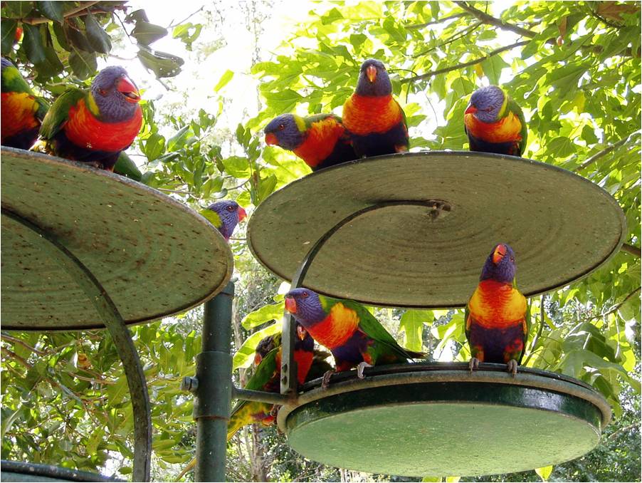 Twice a day, Lone Pine, puts out grains that attract hundreds of wild rainbow lorikeets. The din is deafening but it's lots of fun. |