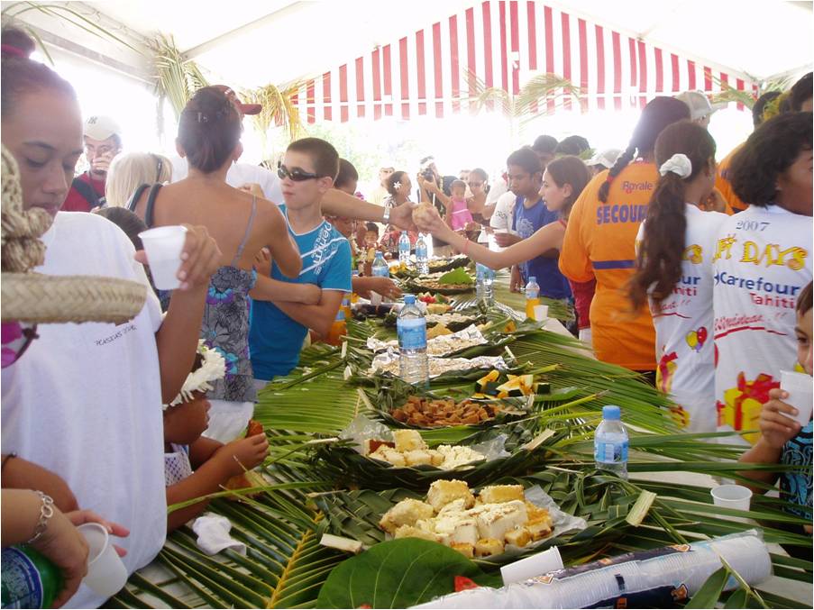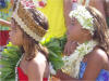 After the opening ceremonies, the villagers invited all to feast on the cakes, fruit, poisson cru (seafood "cooked" in lime juice), poi, coconut meat and many other dishes. Notice that the treats are presented on woven palm platters. |