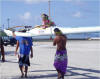 After the parade, the princess and the queen (not shown here) were put back into the pirogues and strong Tuamotu men carried them to the site of the festivities. |