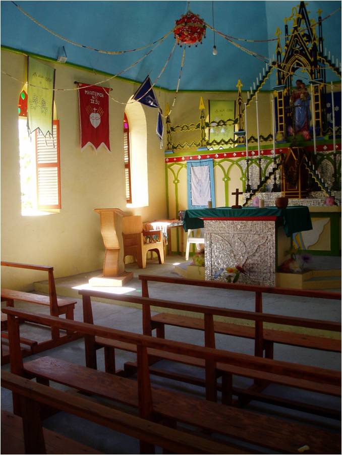 The simple church at Tetamanu has no gold leaf adorning it's altar, but mother of pearl from the abundant oysters of the motus waters. |