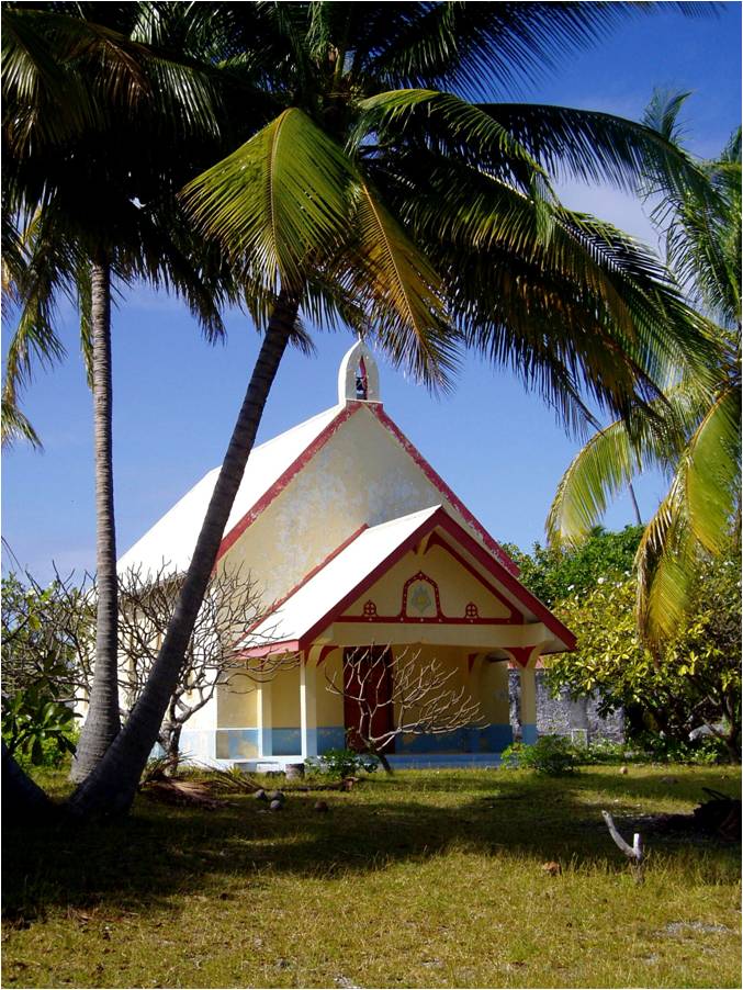 Though there are few island residents, the circa 1860 church of coral has not been abandoned. |