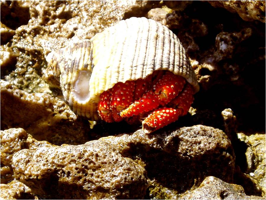This hermit crab was tucked into the raised coral shelf at Oreihara. He had obviously had a close call with something interested in a crab meal. |