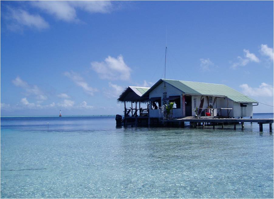 The restaurant at the Tetamanu Village is built on the reef right at the edge of the pass. The buoys are on the other side of the western branch of the pass, the restaurant is on the eastern branch - it's pretty narrow! |