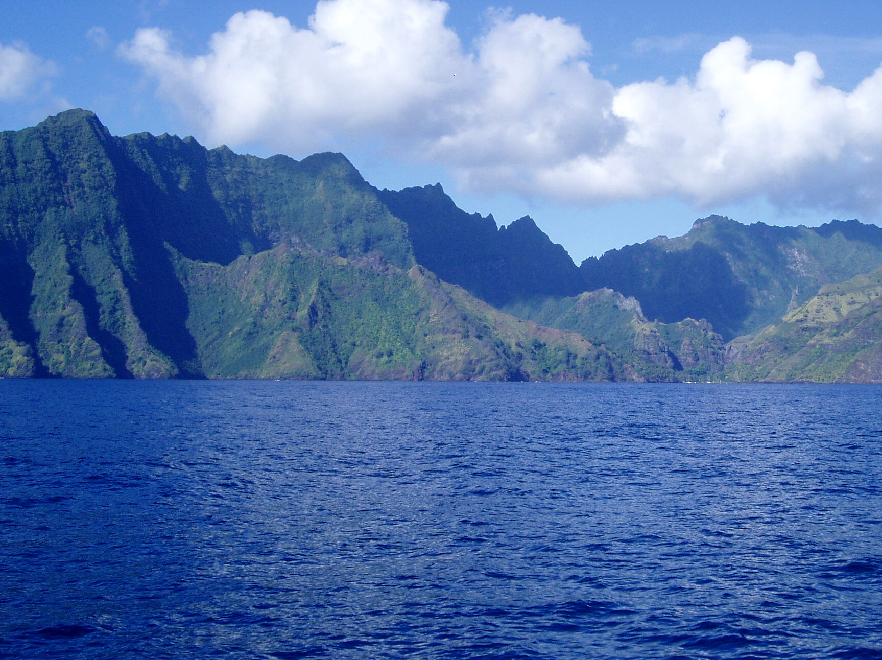 The approach to Hana Vave, also known in French as Vaie des Vierges (Bay of Virgins) on Ile Fatu Hiva, is magnificent and was a welcome site after a long, hot, 48 mile motorboat ride from Hiva Oa. |