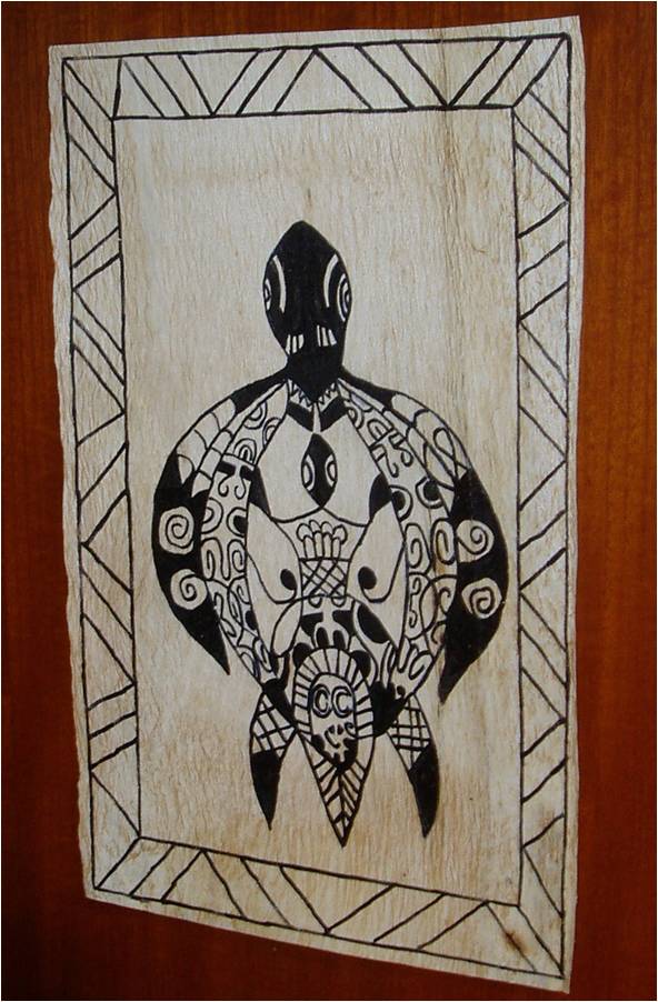 Ile Fatu Hiva is the only place in French Polynesia where tapa cloth is produced by pounding thin bark. This tapa, made by Teresa in Hana Vave is made from the bark of a breadfruit tree. |