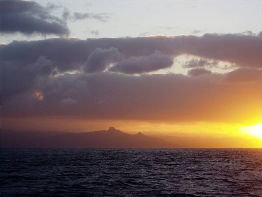 The mountains of Viti Levu popped out from the background one evening as the sun set while we were anchored, awaiting the weather to moderate, at Naigani. |