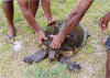 This poor guy had been caught in the lagoon and kept in a seawater tank for most of our stay. The day before we were leaving, they tagged and released him. There was a smaller turtle still in captivity that was awaiting a tag since they had run out. |