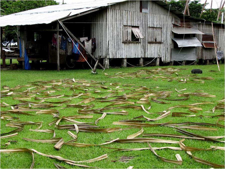 These pandanus bundles are the result of a few days work in stripping the fronds of their thorns; tedious and time-consuming work. The bundles will be boiled in fresh water for about 20 minutes prior to drying and weaving them into mats. |