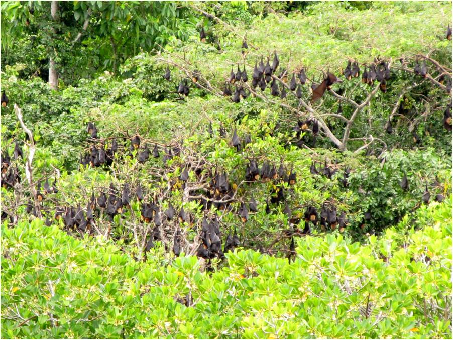 Fruit bats (referred to simply as "foxes" by the locals) roost by the hundreds in trees on Likoni Point in Nasosobu, leaving their perches and flying north as the sun begins to set. |