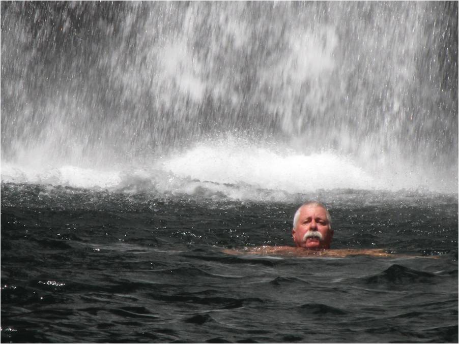 Philip donned his bathing suit and swam out to where the water landed from the falls above. |