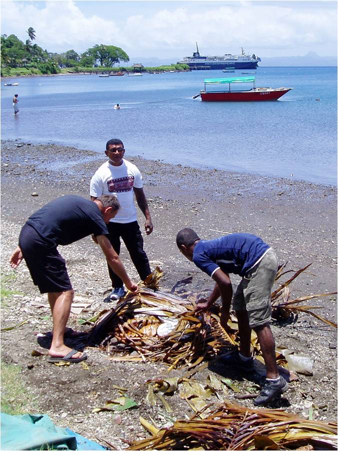 This type of earth oven is used all over the Pacific. Pate (shown here) explained that a hole is dug and lined with stones and a large fire is built on top of the stones. The fire super-heats the stones and when it burns down the contents of the lovo are stacked inside and the entire thing is insulated by palm leaves and then topped with banana leaves. |