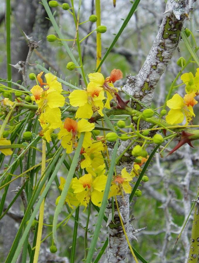 We don't know the common name for this "parkinsonia" flower but it shouts out during dry season from a tree that looks grey and barren, |