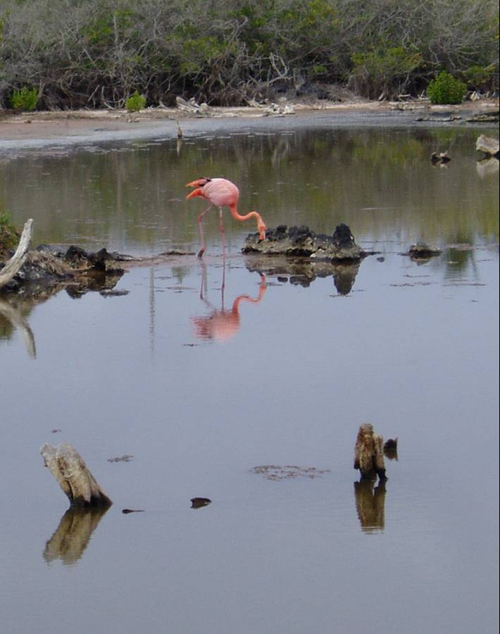 Flamingos are rare and shy even in the Galápagos. Isabela's lagoons are one place they survive. |