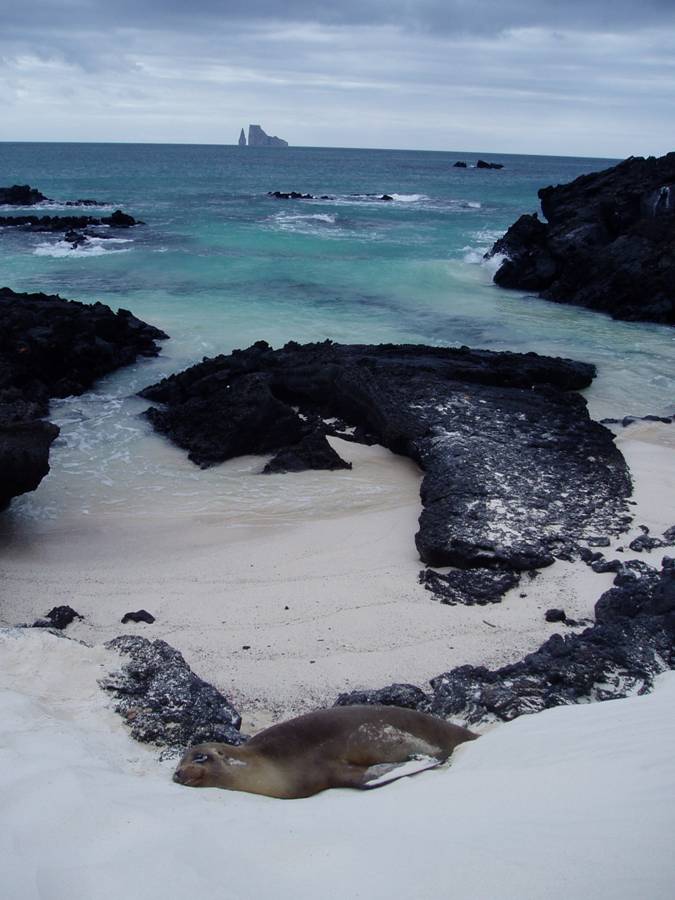 The spires of Leon Dormido drawf the snorkelers who were drifting through the gap in company of Galapagos sharks. |