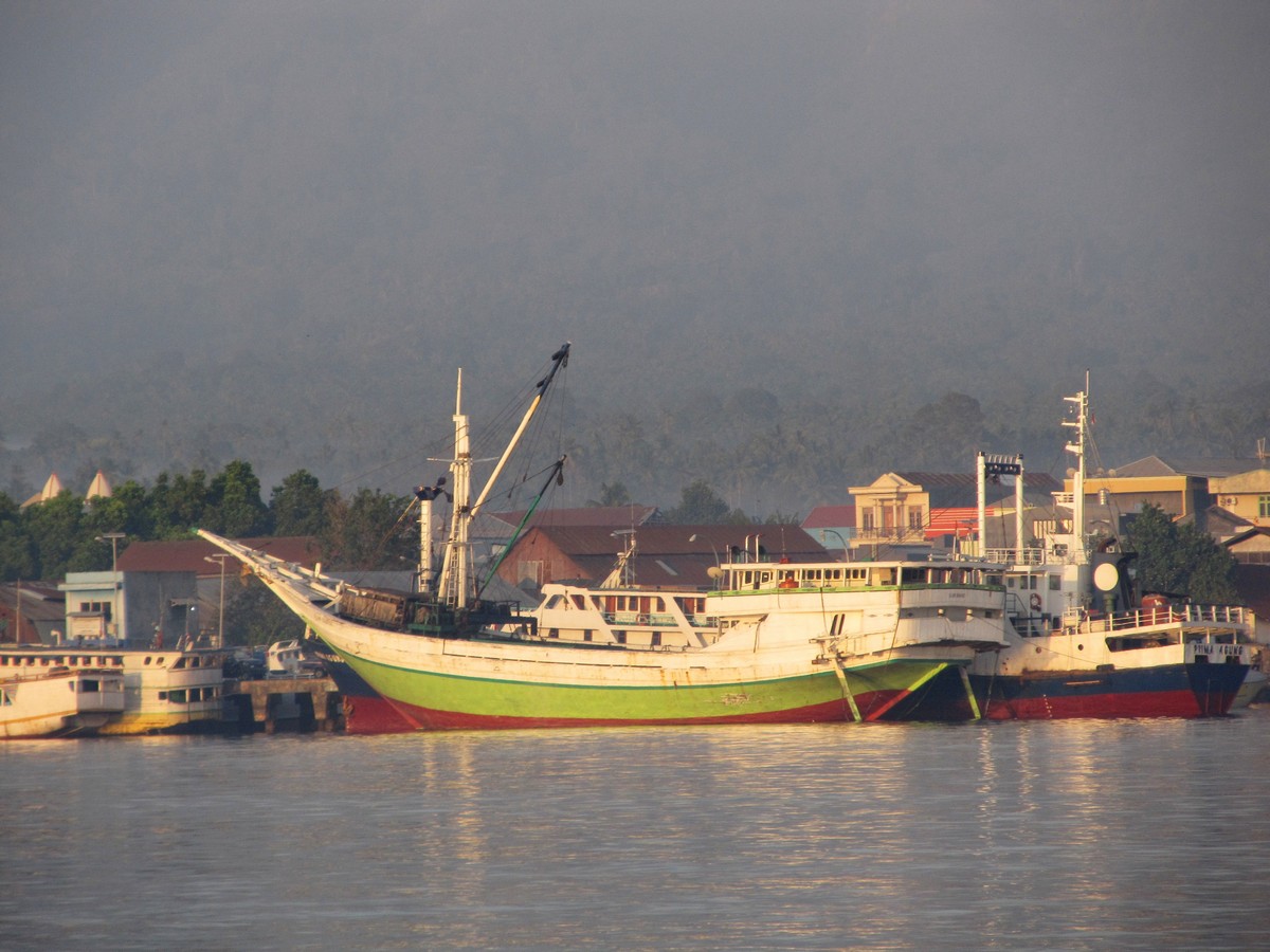 dominates the landscape of Tobelo on Halmahera Island. It spews ash continuously which makes the soil fertile but fills the air with gritty soot. A local ferry, a ketinting, zips around driven by a small Chinese engine not much bigger than a weed-whacker, with no neutral gear! |