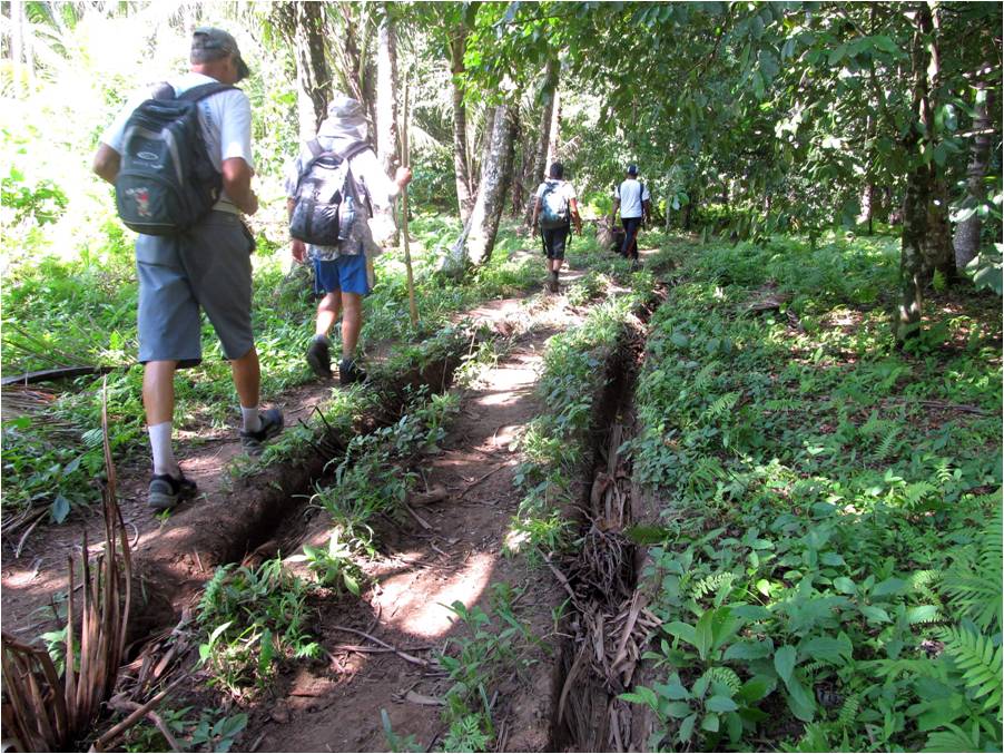 This trail cut deeply into the volcanic fine, gritty soil close to the river. There were deep ruts made by an oxcart which is used to haul out the copra crop. |