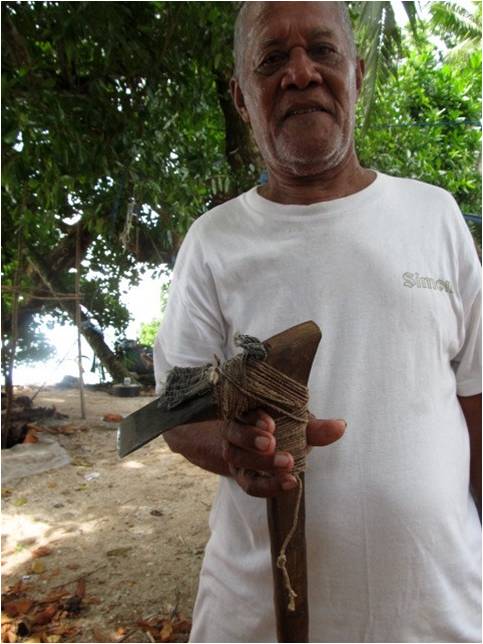 Greets yachts and makes you welcome. Here he holds a tektek (adze) hand made from truck springs and so sharp you could shave with it. |