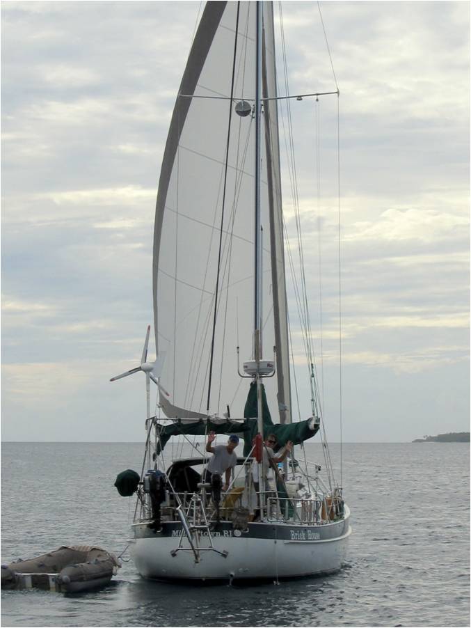 Friends Rebecca and Patrick had spent well over six months in Majuro replacing their mast that they lost 500 miles south in Kiribati. This was the day they finally sailed out...you can see the joy on their faces as they pull away west towards the pass. |