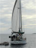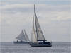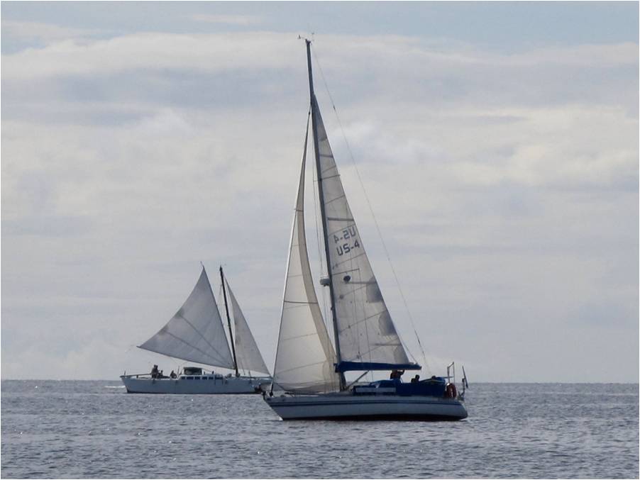 The local yacht club (clubhouse is a corner of the restaurant at the Marshall Islands Resort) hosts a learn to sail day for crew interested in club racing. Here Wakataitea and Hawkeye tack back and forth with students aboard. |
