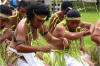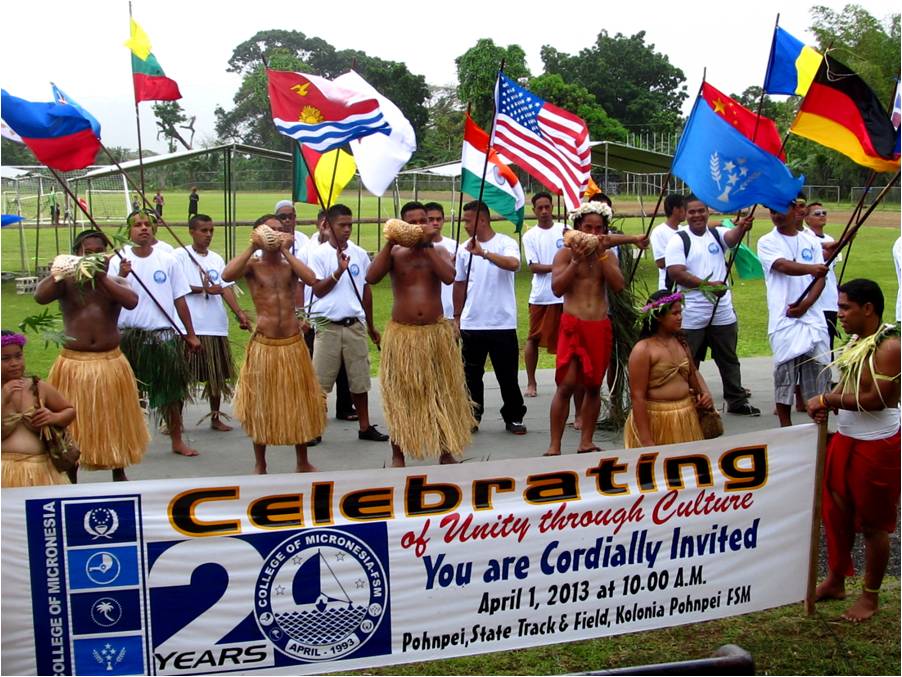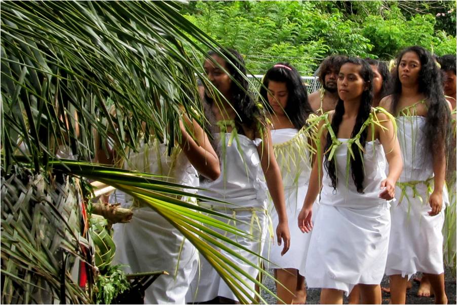 students pulled out all the stops for their traditional Pohnpeian dance set to the percussion of dokia sticks. |