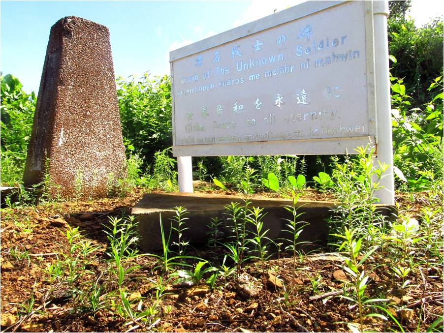 of an unknown soldier from that era has a sign written in English, Pohnpeian and Japanse |