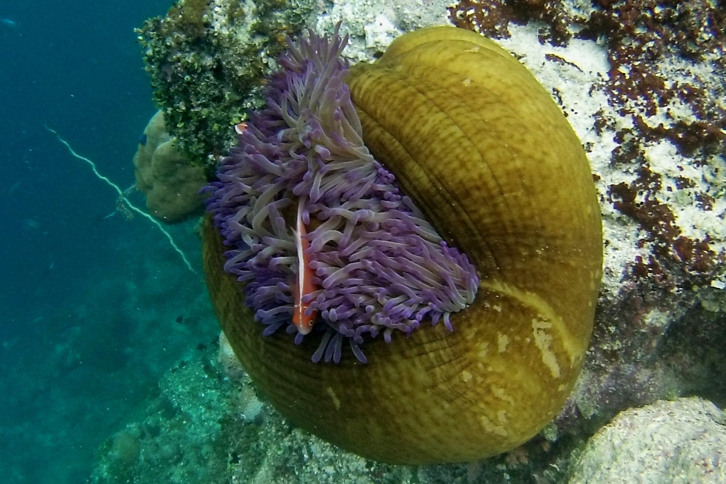 and its skunk anemonefish, ever so slowly closed while we tried to dive down and take this picture. It was a good ways down and those devilish little fish were intent on hiding! |