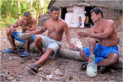 is coconut "beer". It is fermented from the sap of the coconut flower over 4 days. The inoculum is present in the shell. Men "cut" their tuba three times a day. |