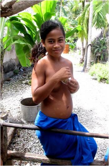 is not yet wearing a lavalava which means she has not yet assumed the position of woman that brings with it new responsibilities. |