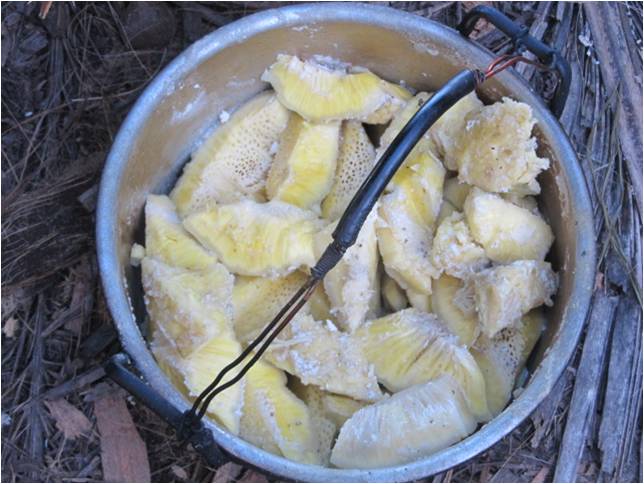 showed us his technique for making twine. Note the camp pad on his leg to prevent skin abrasion from the rough fibers that have been soaken in seawater for 2-3 months. |