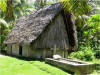 Homes of tall steep coconut thatch were sometimes combined with concrete walls, "to make it more cool inside". |