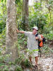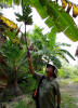 On the trail to the finca, Dulce Nombre, Philip inspects a tree that contains a machete slash tally of.....? Visitors? Lunchmates? |