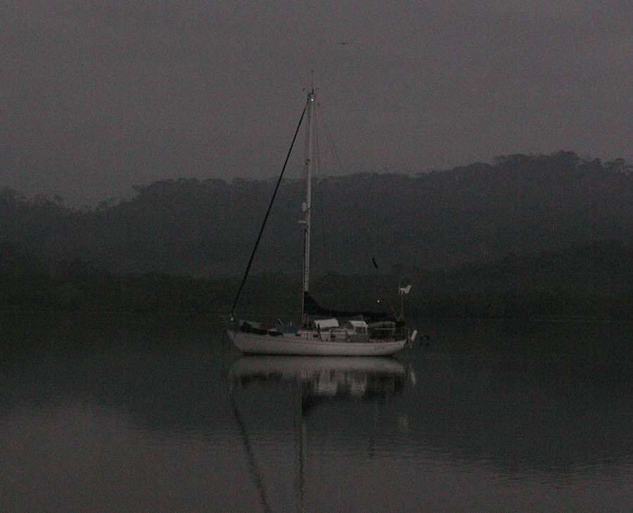 Carina reflects her beautiful lines at dawn's light while anchored in the Rio Sabana, Darién, Panamá (Claire de Lune photo). |