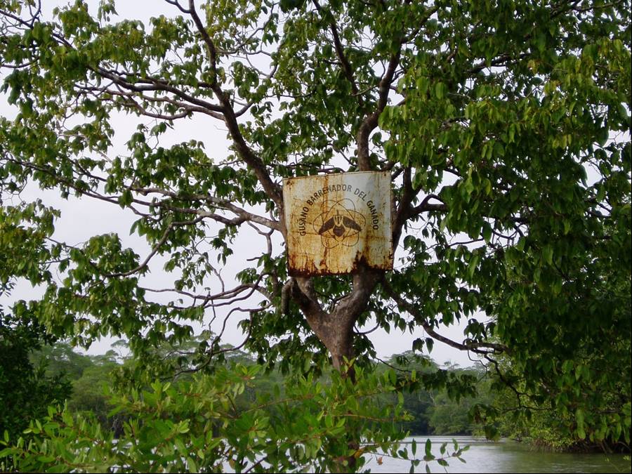This sign in the middle of the Darién, Panamá warns of a certain type of fly carrying a worm dangerous to livestock. We saw no livestock. |