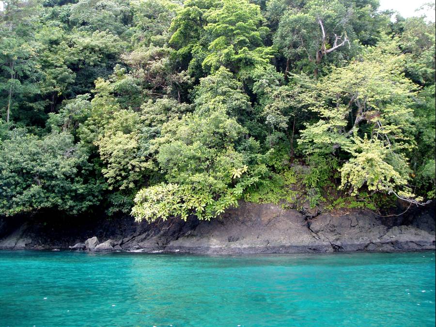 The water at Isla Canal de Afuera (part of Parque Nacional Coiba) was clear to 50 feet and was deep right up the the lush jungle slopes.