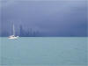 We sailed into this severe storm cell near Isla Del Rey while trying to move to another anchorage. In this photo, several waterspouts (dangerous tornados at sea) are beginning to form. Winds in this storm exceeded 30 knots with slashing rain that severely reduced visibility. |